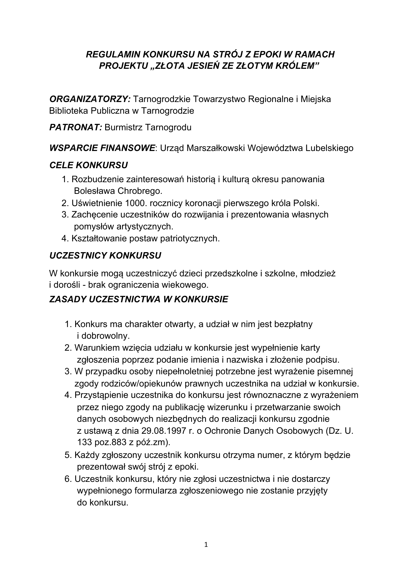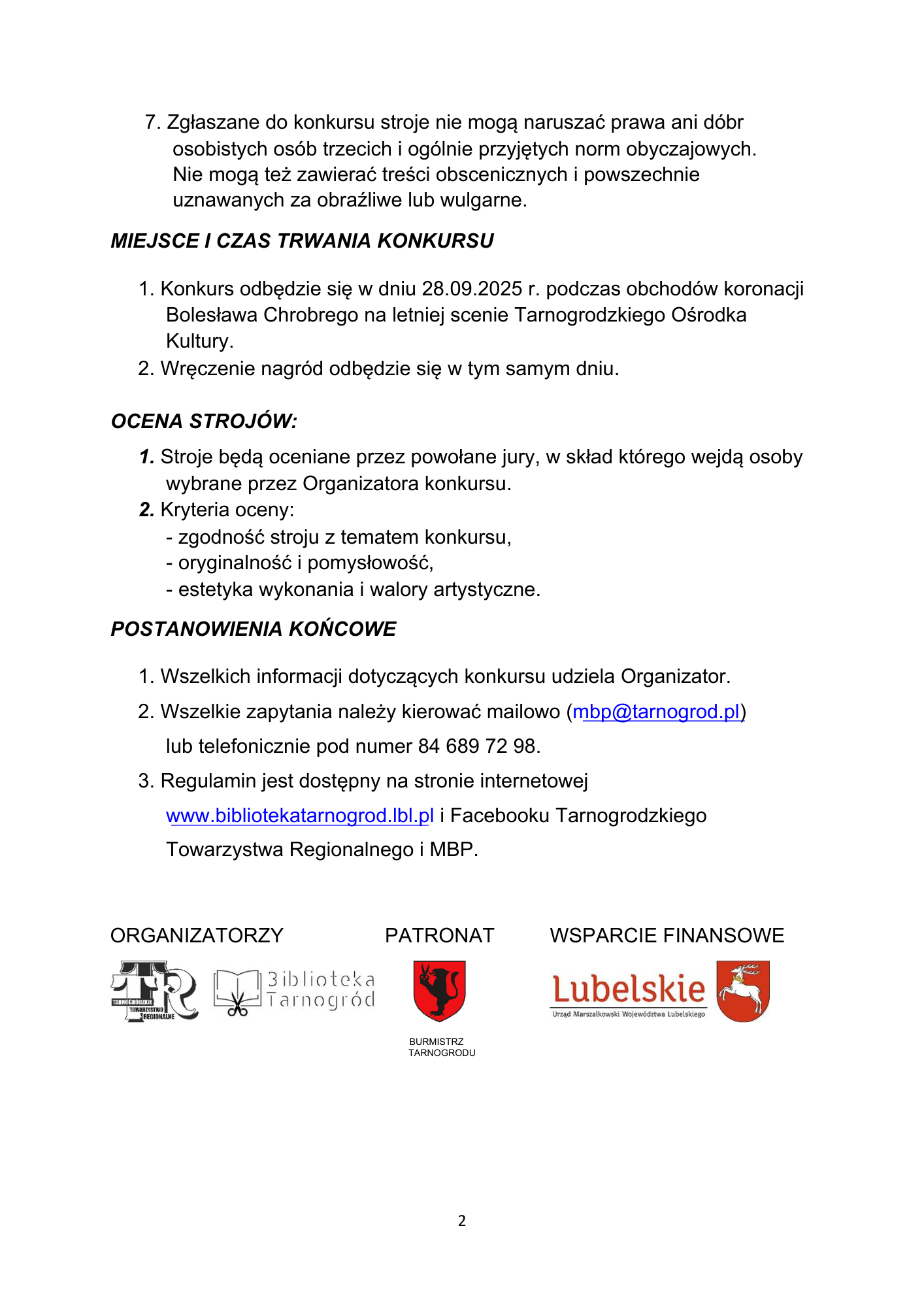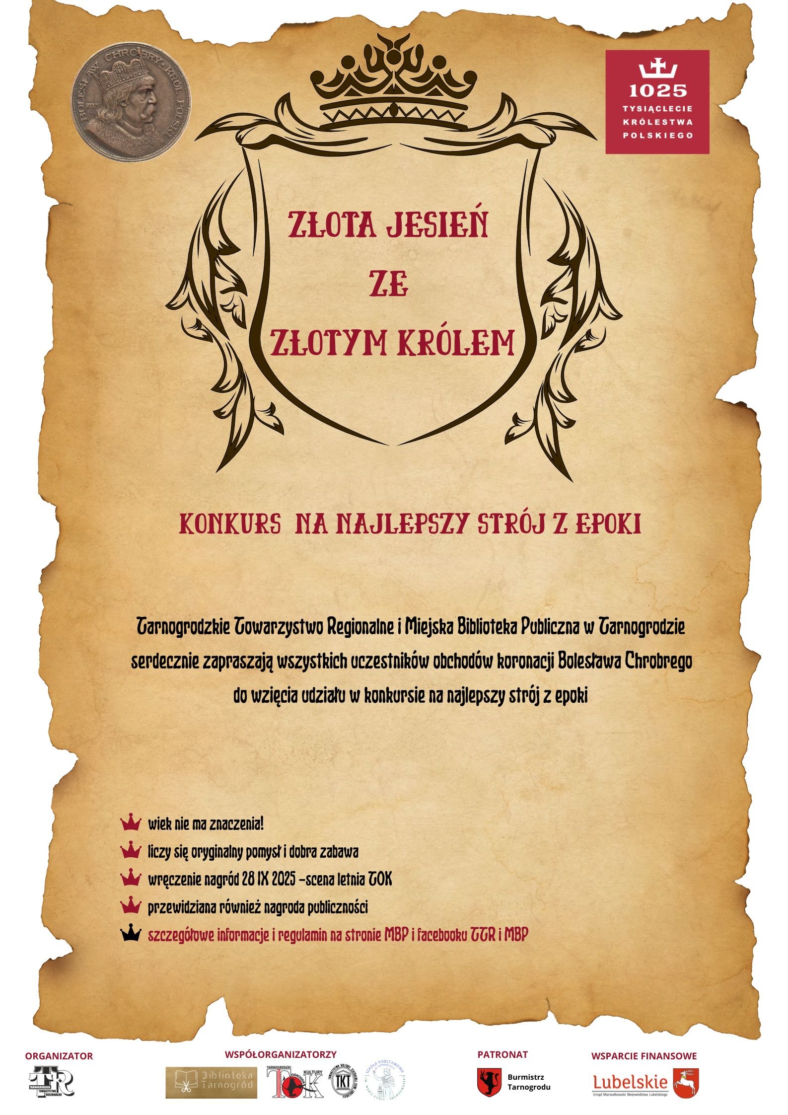 - Konkurs odbędzie się w dniu 28.09.2025 r. podczas obchodów koronacji Bolesława Chrobrego na letniej scenie Tarnogrodzkiego Ośrodka Kultury.