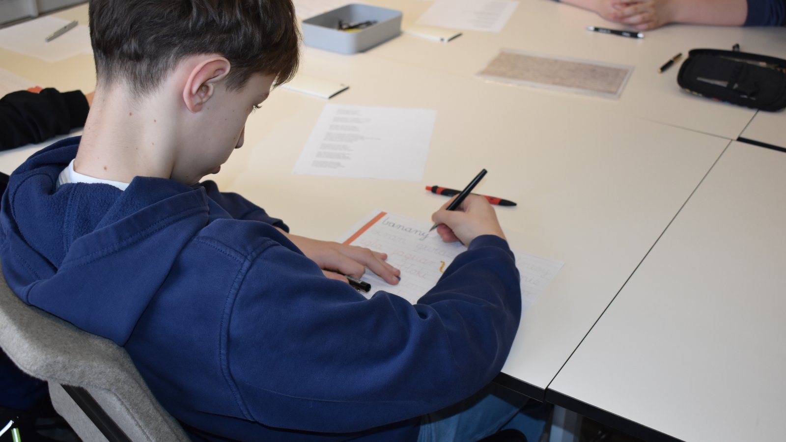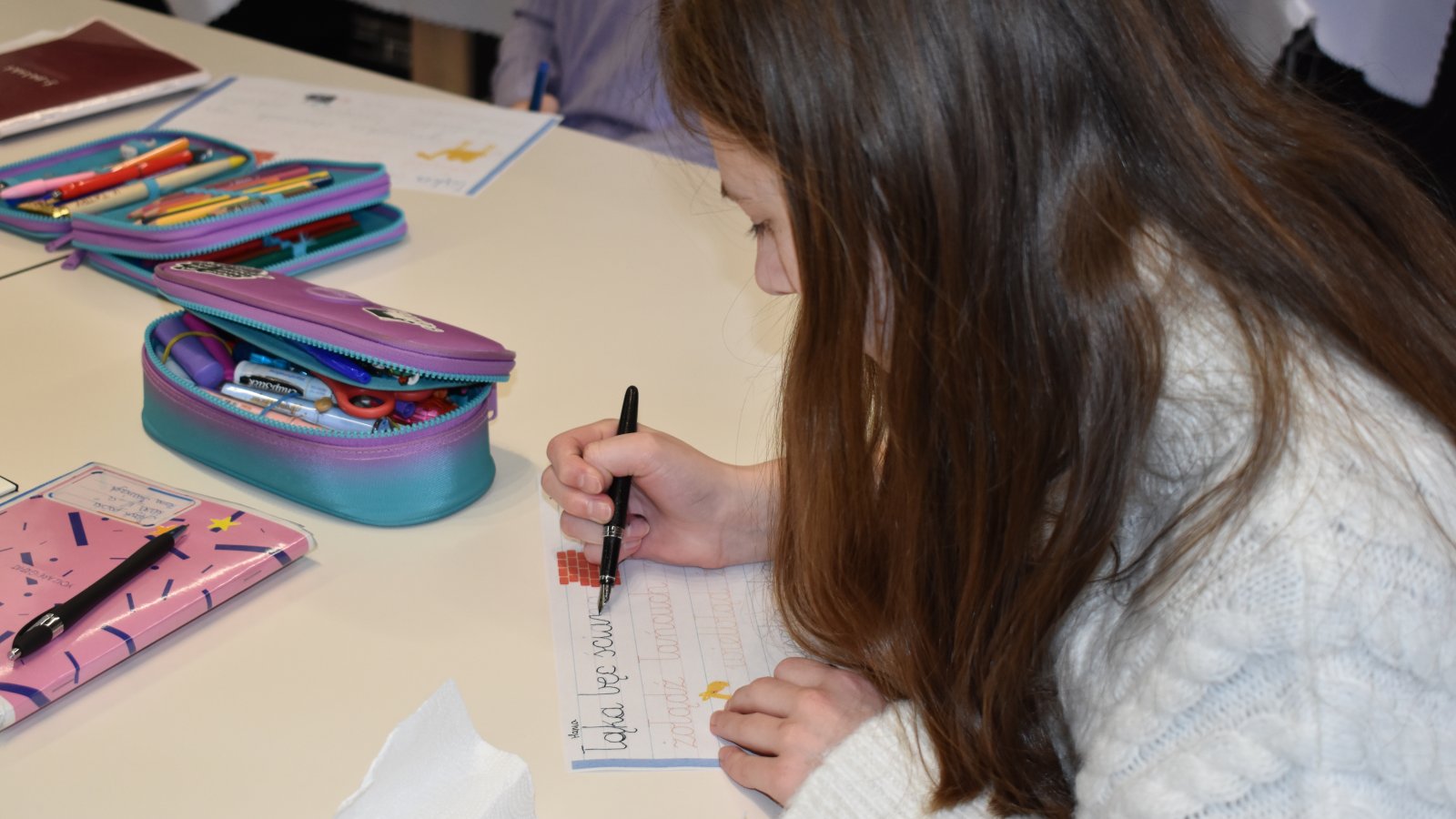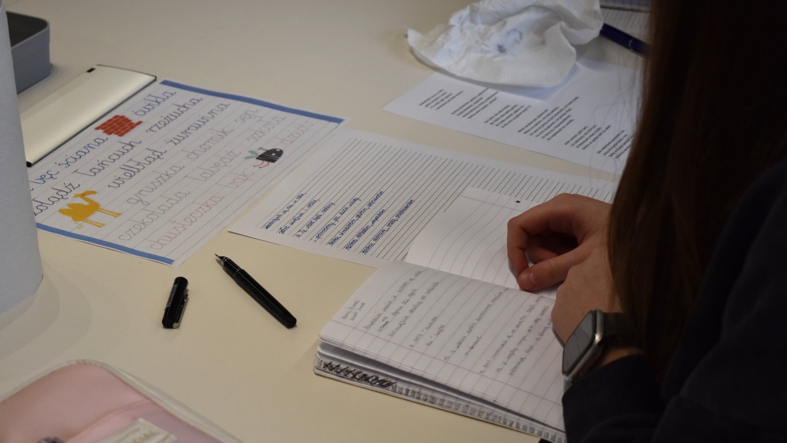 Warsztaty upłynęły na opowieściach o historii pióra wiecznego, kreśleniu pierwszych linii, owali i kształtów liter, kleksach i palcach w atramencie. To nowe doświadczenie pobudzające kreatywność, poprawiające koncentrację, pozwoliło na docenienie techniki pisania piórem.